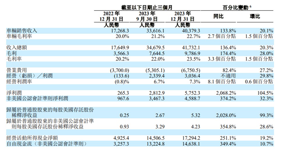 在第四季度核心关注的指标里,理想实现营业收入 417.3 亿元,同比增长 136.4%,环比增长 20.3%,超过市场预期的 398 亿元;实现净利润 57.5 亿元,同比增长 2068.2%,环比提升 104.5%;毛利率为 23.5%,同比增加了 3.3 个百分点,环比增加了 1.5 个百分点。