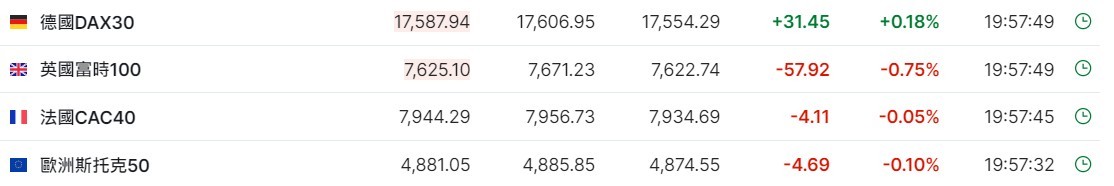 2. 截至发稿,德国 DAX 指数涨 0.18%,英国富时 100 指数跌 0.75%,法国 CAC40 指数跌 0.05%,欧洲斯托克 50 指数跌 0.10%。