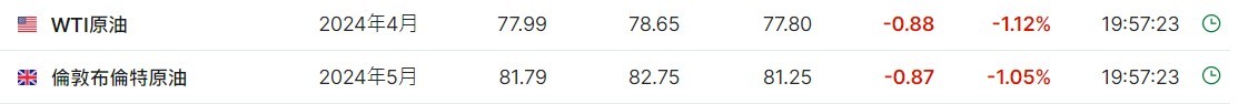 3. 截至发稿,WTI 原油跌 1.12%,报 77.99 美元/桶。布伦特原油跌 1.05%,报 81.79 美元/桶。