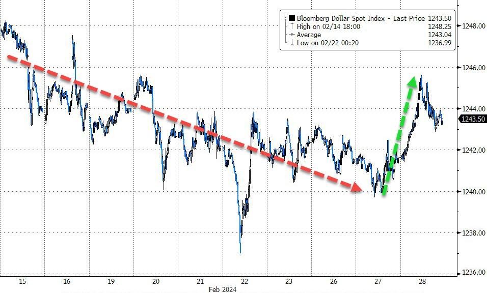 到周三美股收盘时,美元指数略低于 104.00,日内涨 0.1%;追踪美元兑其他十种货币汇率的彭博美元现货指数涨近 0.2%,反弹至 2 月 19 日以来同时段高位。