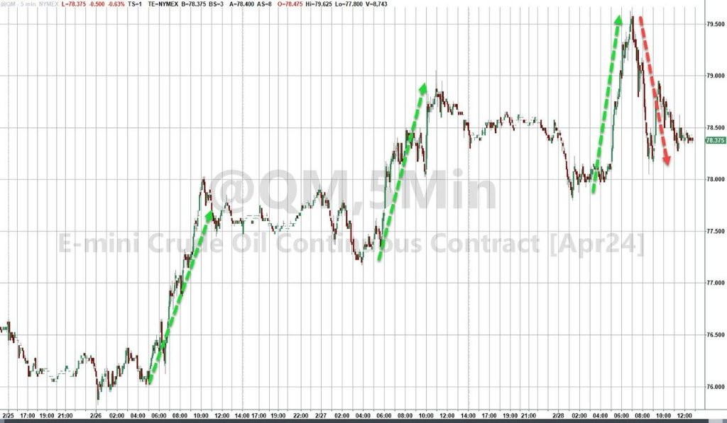 最终,原油收盘涨跌互见。连涨两日的 WTI 4 月原油期货收跌 0.42%,报 78.54 美元/桶,跌落周二刷新的 2 月 16 日 79.19 美元以来收盘高位。布伦特 4 月原油期货收涨 0.03 美元,涨幅 0.04%,报 83.68 美元/桶,连涨三日,刷新 2023 年 11 月以来收盘高位。而主力合约布伦特 5 月原油期货收跌 0.6%,报 82.15 美元/桶。