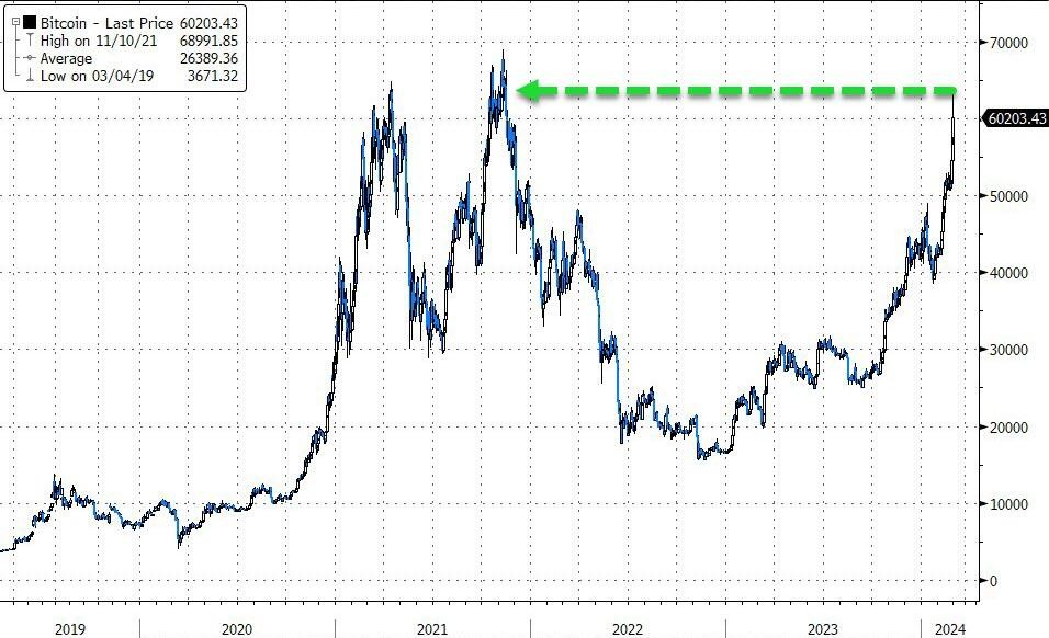而比特币继续狂欢,两年多来首次盘中突破 6 万美元大关,一度暴拉超 7000 美元,进入本周以来持续创逾两年新高。比特币概念股由此水涨船高。一个多月前比特币现货 ETF 在美国正式上市交易后,多家机构有意发行新的加密货币 ETF,将导致供应增长放缓的减半比特币 4 月将至,害怕错过这波行情的 FOMO 心理,都是比特币这轮大涨的推手。