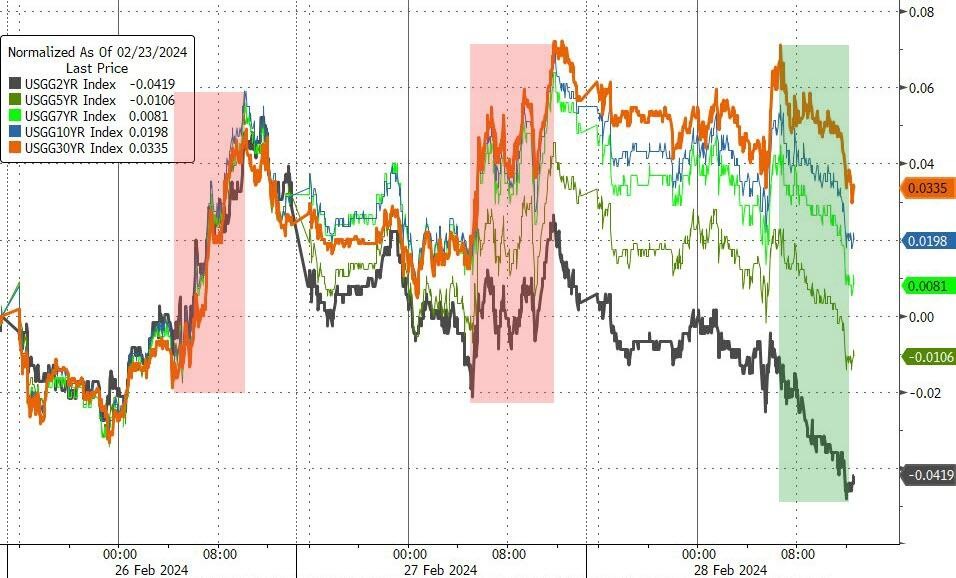 美国 10 年期基准国债收益率在亚市早盘曾上测 4.31% 刷新日高,美股盘前美国 GDP 公布后,先曾下测 4.27% 刷新日低,后反弹上测 4.71 刷新日高,美股开盘后持续回落,未继续靠近上周五上逼 4.35% 刷新的 2023 年 12 月 1 日以来高位,美股尾盘下破 4.27%,到债市尾盘时约为 4.26%,日内降约 4 个基点,在连升两日后回落。