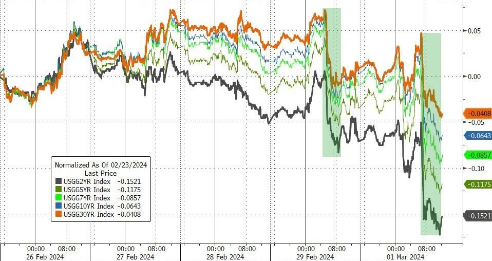 对利率前景更敏感的 2 年期美债收益率在欧股盘前曾升破 4.64% 刷新日高至 4.6434%,美国 SM 制造业数据公布前,美股早盘处于 4.62% 上方,数据公布后迅速下破 4.60%,美股午盘下破 4.52%,刷新 2 月 15 日以来低位,较日高回落近 13 个基点,到债市尾盘时约为 4.53%,日内降约 9 个基点,本周累计降约 16 个基点,止步四周连升。