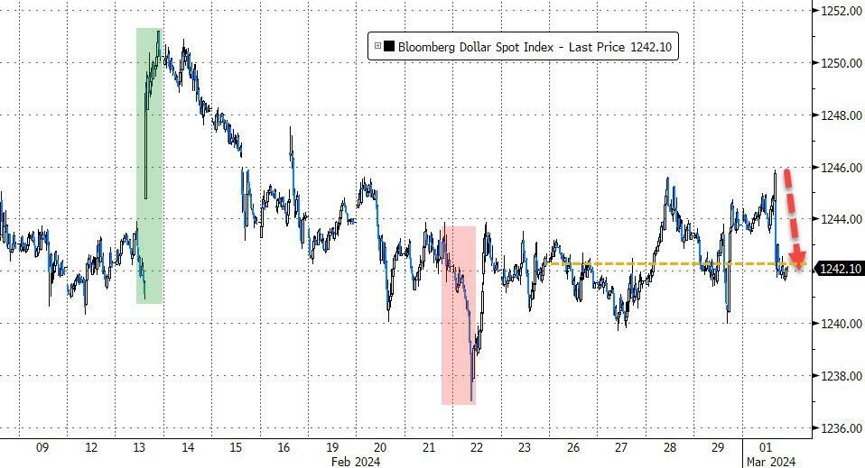 到周五美股收盘时,美元指数略低于 104.00,日内跌逾 0.2%;追踪美元兑其他十种货币汇率的彭博美元现货指数跌逾 0.1%,跌落 2 月 19 日以来同时段高位,盘中涨近 0.2% 后转跌,和美元指数均本周累计微跌、未能在上周终结七周连涨后反弹。