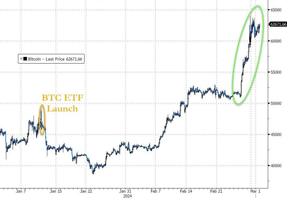 汇市方面,ISM 数据公布后,创逾一周盘中新高的美元指数迅速转跌,多种非美货币反弹,而日本央行行长表态暗示 3 月加息可能没戏后,日元回落至 150 下方,跌离周四所创的两周多来高位。比特币盘中曾反弹超 2000 美元,虽然还未逼近周三上测 6.4 万美元所创的两年多来高位,但本周累计涨幅已超过 20%。