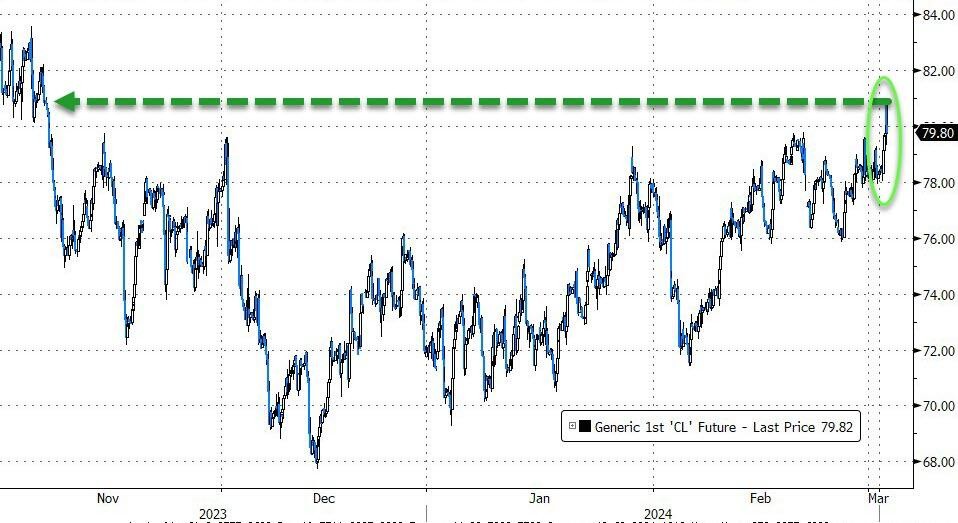 最终,周四齐跌的原油均收涨。连跌两日的 WTI 4 月原油期货收涨 1.71 美元,涨近 2.19%,报 79.97 美元/桶;布伦特 5 月原油期货收涨 1.64 美元,涨约 2.00%,报 83.55 美元/桶,和美油均刷新 2023 年 11 月 6 日报美元以来收盘高位。
