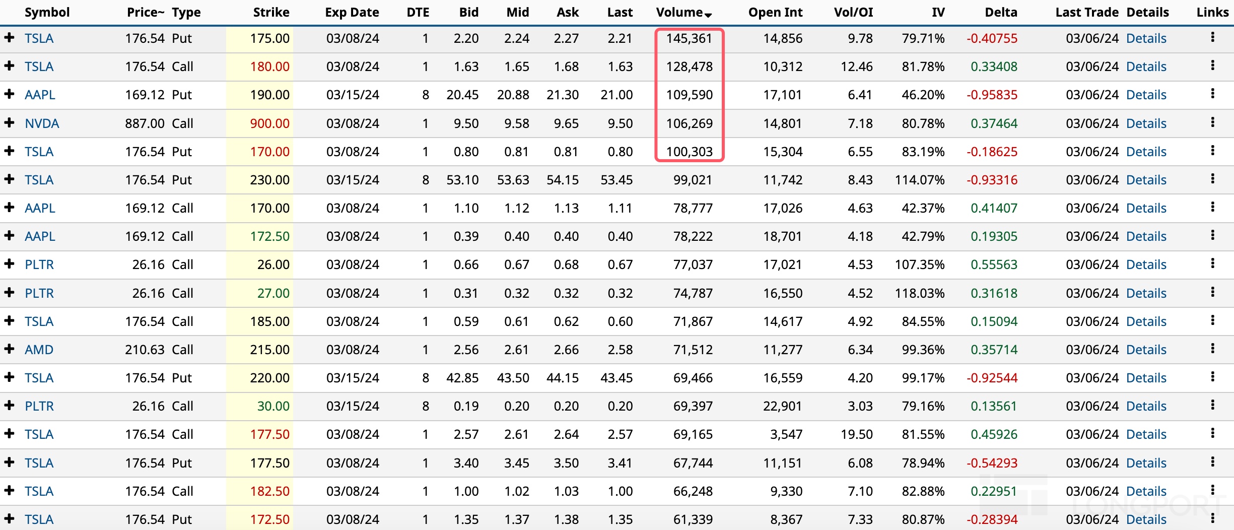 隔夜最火合约:3 月 8 日到期、执行价 175 美元的特斯拉 put,成交 14.5 万张!Palantir 期权成交暴涨至 152 万张,看涨期权占比 82.5%;京东期权成交暴涨至 31 万张,看涨期权占比 76%。