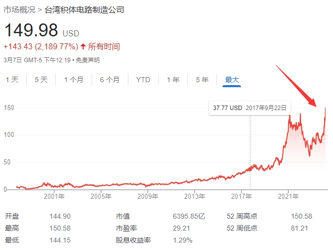 3 月 8 日隔夜,台积电 ADR 大幅上涨,股价涨幅约 5.94%,刷新盘中历史最高位至 149.98 美元,盘中市值突破 7700 亿美元。这一涨势延续了该股近期的强劲表现,自去年 10 月低点以来,台积电股价已回升逾 70%。
