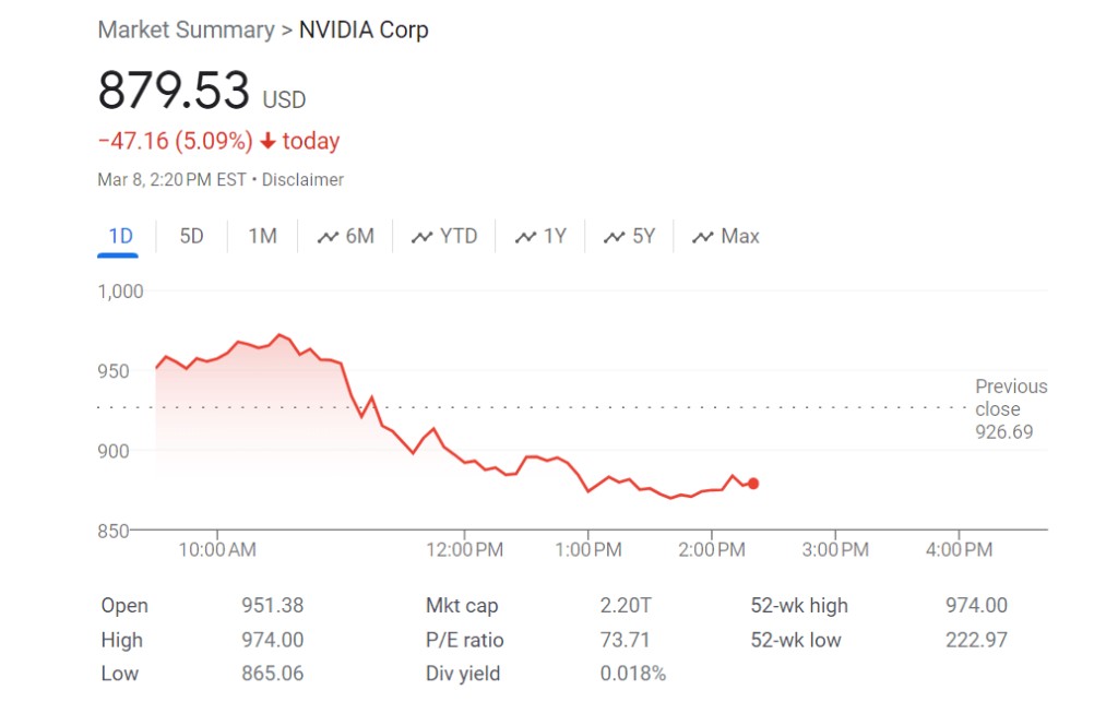 周五美股时段,英伟达早盘大涨超过 5%,达到 974 美元的历史新高,但此后在没有明显消息的刺激下,盘中急转直下,一度跌幅达到约 5%,最低跌破 880 美元一线。英伟达的高位回落,也拖累芯片股普遍走低,台积电涨幅从大约 6% 收窄至不到 2%,迈威尔科技跌 8.7%,博通跌约 4.4%。