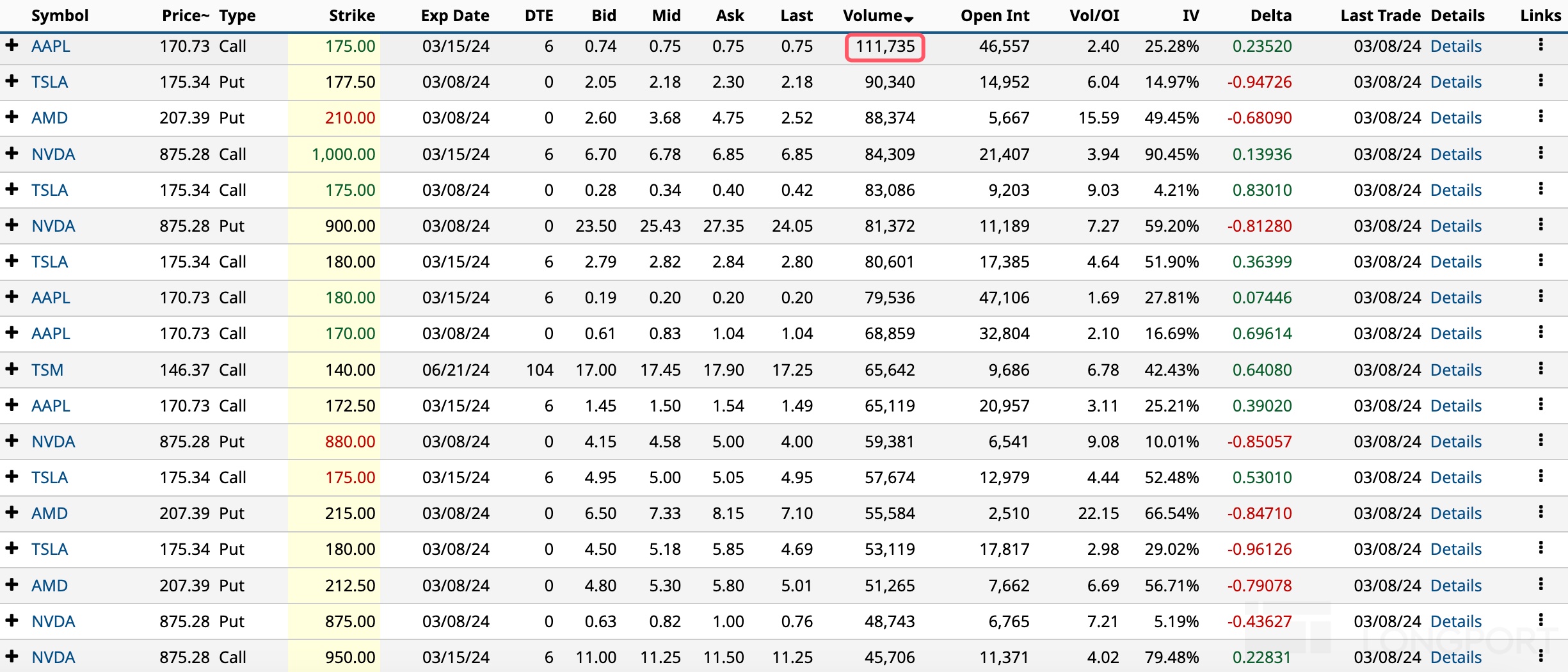 上周五最火合约:3 月 15 日到期、执行价 175 美元的苹果 call,成交超 11 万张;当日到期、执行价 177.5 美元的特斯拉 put 成交 9 万张。台积电期权成交大涨至 57 万张,6 月 21 日到期、执行价 140 美元的看涨期权成交超 6 万张。
