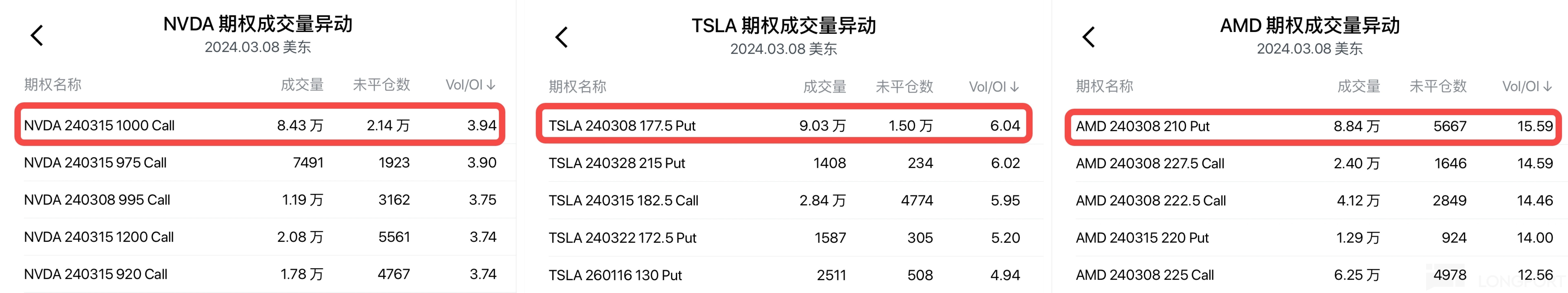 英伟达跌超 5%,期权成交暴涨至 407 万张,看涨期权占比 62.7%。3 月 15 日到期、执行价 1000 美元的看涨期权成交超 8 万张,3 月 8 日到期、执行价 900 美元的看跌期权成交也超 8 万张。