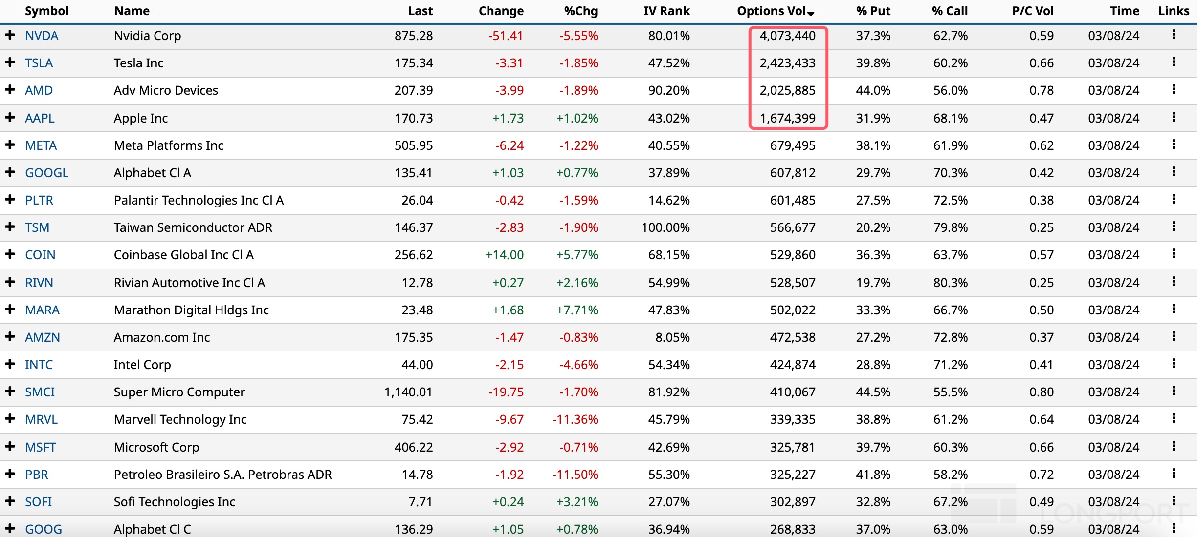 上周五前十大美股期权成交:英伟达、特斯拉、AMD、苹果、Meta、谷歌 A、Palantir、台积电、Coinbase、Rivian。