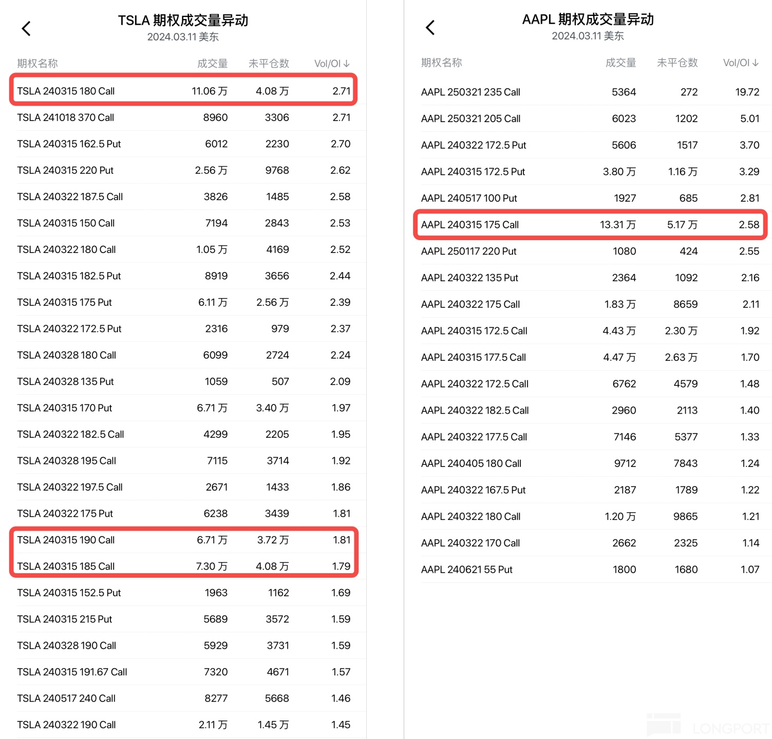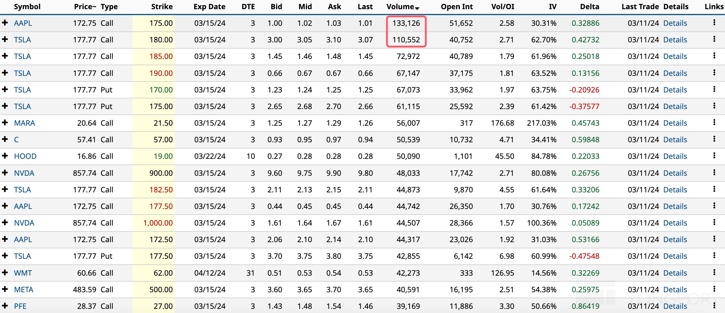 隔夜最火合约:3 月 15 日到期、执行价 175 美元的苹果 call,成交超 13 万张。执行价 180 美元的特斯拉 call 成交 11 万张,执行价 900 美元的英伟达 call 成交不足 5 万张。