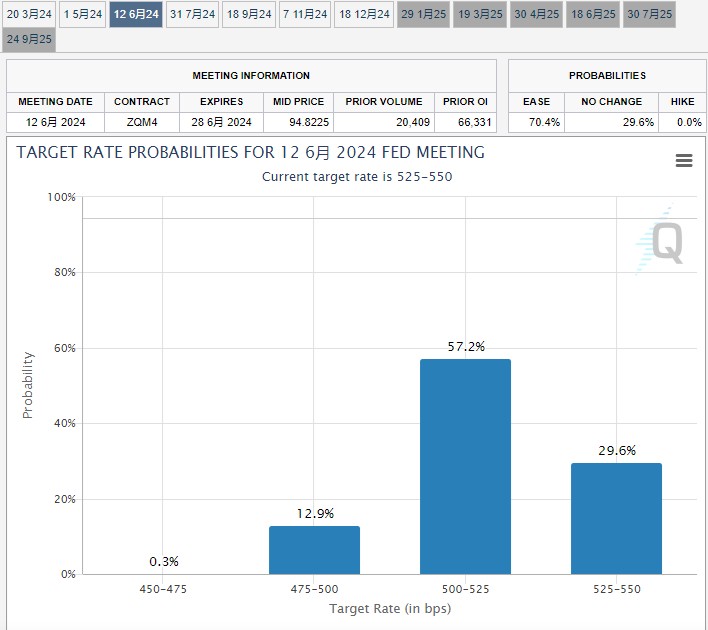 根据智商所 FedWatch 工具显示,交易员预计今年将有 3 到 4 次降息,其中 6 月降息 25 个基点的概率近 60%。