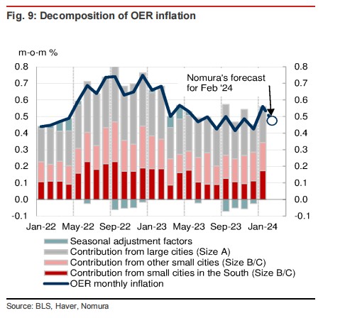 - 最为关键的住房通胀增速将放缓,继 1 月份 OER 出现跳涨后,2 月 OER 将回落至 0.47%,但主要住所租金增幅继上月放缓后小幅回升至 0.42%。