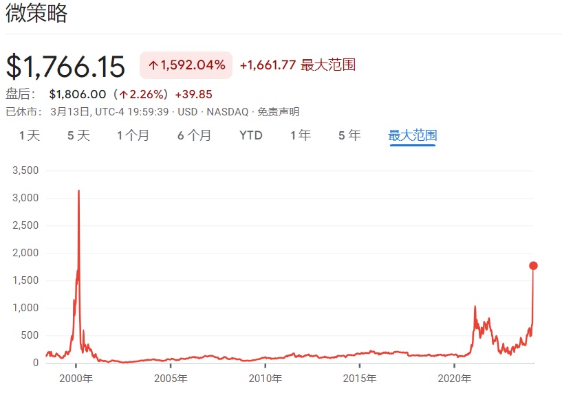 消息公布后,MicroStrategy 股价连续大涨,周三美股收涨 11%,报 1766.15 美元。自 3 月 6 日(公司宣布发债定价当天)以来,该股已累计上涨 68% ,继去年暴涨 346% 后,今年已飙升 180%。