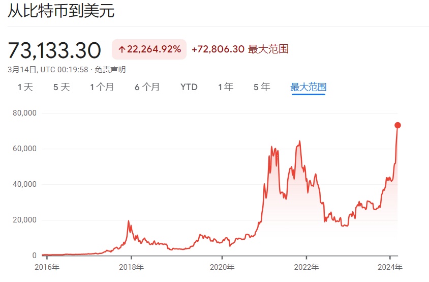 比特币价格在周三上涨了 2.7%,一度升至 73400 美元上方。