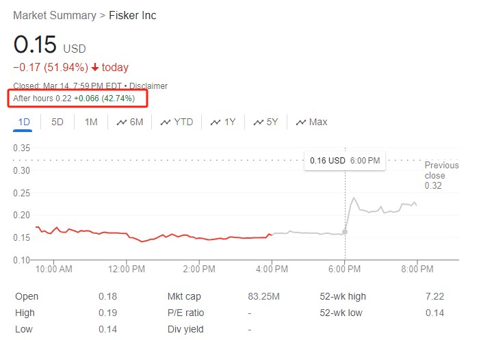 此话一出,Fisker 股价峰回路转,美股盘后,从暴跌又暴涨 42.74% 至 22 美分。