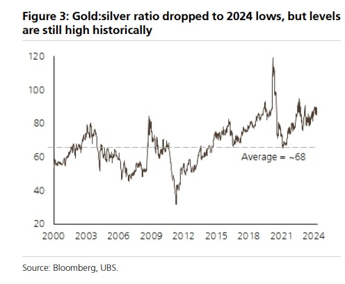 瑞银认为,目前金银比一直徘徊在较高水平,这意味着相对于黄金,白银更具吸引力。尽管白银今年迄今为止的表现与其历史表现相比还相对温和,但预计随着时间的推移,特别是在美联储下半年开始降息的情况下,白银的表现将进一步改善。