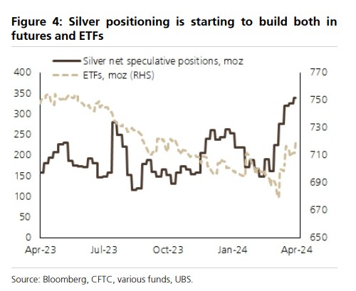 白银作为黄金的替代品受到投资者青睐,瑞银预计白银相对黄金的表现将进一步改善。白银供需偏向紧张有利于银价上行,但这本身不足以推动银价大幅上涨。瑞银认为,白银的净多头头寸和 ETF 已经开始上升,白银市场可能持续出现实物赤字。另外,在绿色技术和可再生能源转型中,白银也扮演着重要角色。