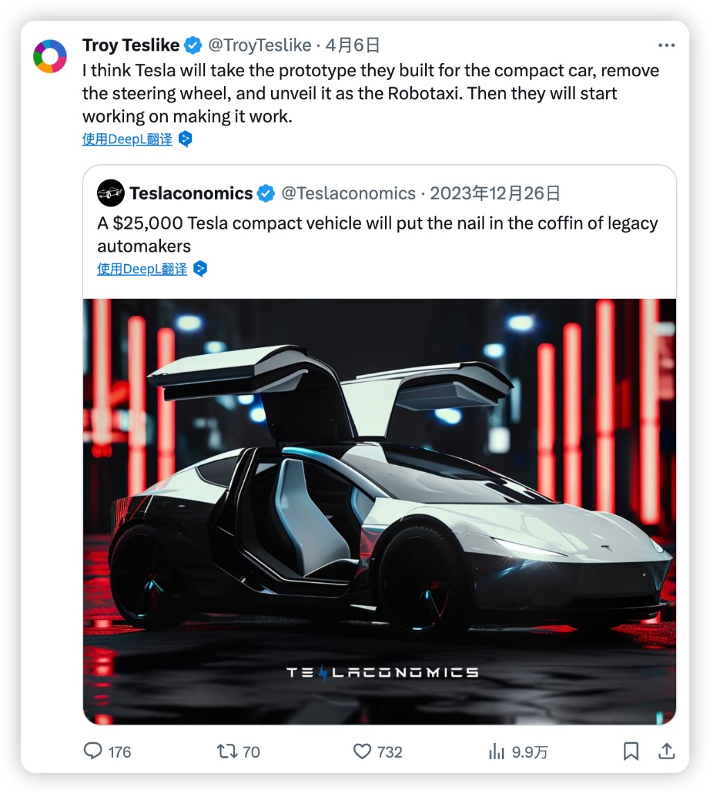 据知名特斯拉独立分析师 Troy Teslike,8 月 8 日将发布的 Robotaxi 可能就是传闻中的廉价小车 Model 2 去掉方向盘的版本。他预计特斯拉会先发布 Robotaxi,“然后再想办法让它能上路”。