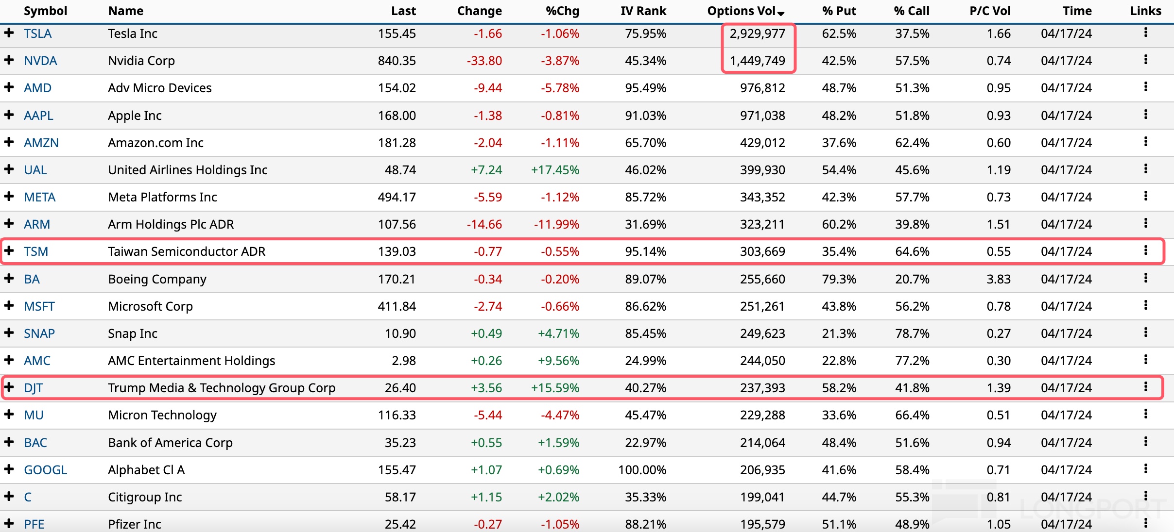 隔夜前十大美股期权成交:特斯拉、英伟达、AMD、苹果、亚马逊、美联航、Meta、ARM、台积电、波音。