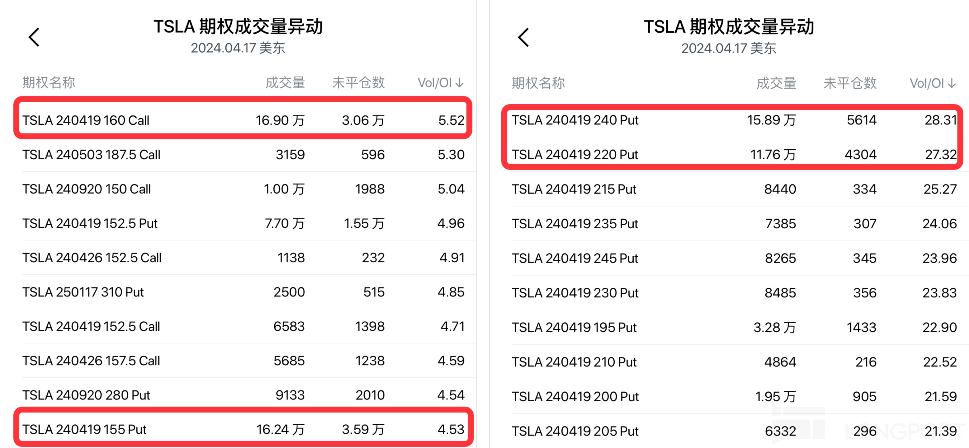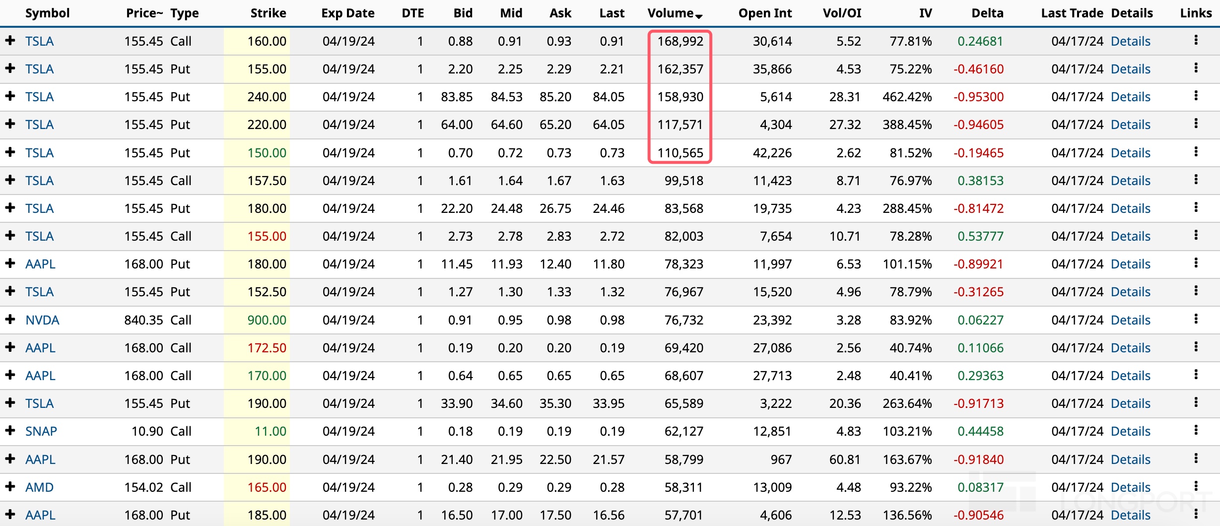 隔夜最火合约:4 月 19 日到期、执行价 160 美元的特斯拉 call 成交近 17 万张,执行价 155 美元、240 美元、220 美元和 150 美元的特斯拉 put 分别成交 16 万张、15.8 万张、12 万张和 11 万张。
