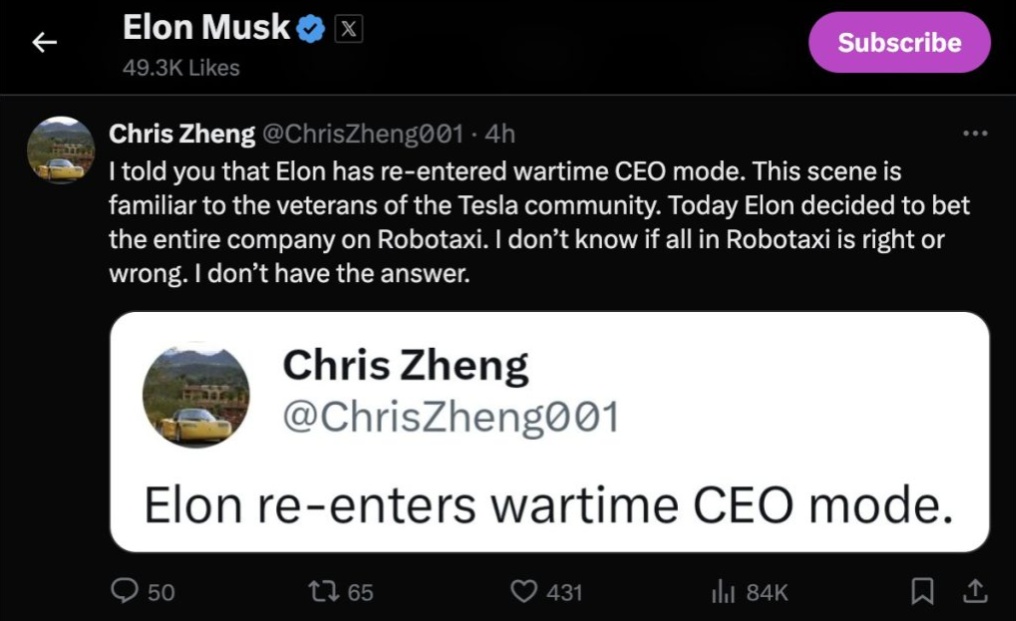 上周,在向全公司发送一封电子邮件,宣布特斯拉将在全球范围内裁员 10% 以上后,马斯克在 X 上点赞了一个帖子,帖子内容称马斯克重新进入战时 CEO 模式,决定将整个公司押注在 Robotaxi 上。