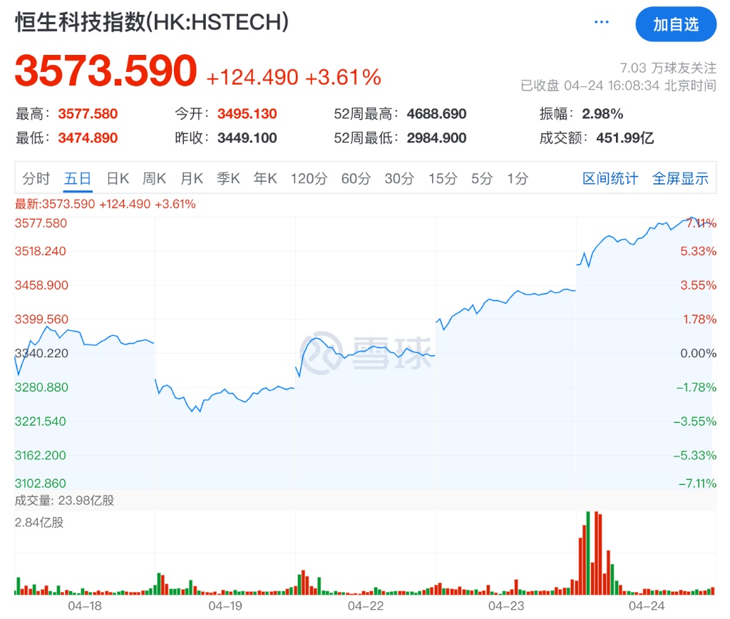 4 月 24 日周三,港股市场再度高开高走,恒指突破并站稳 17000 点以上,携手恒生国企指数创近 5 个月的盘中新高,科技股连续第三日集体走强,恒生科技指数大幅上涨 3.61%,三日累涨 8.2%。