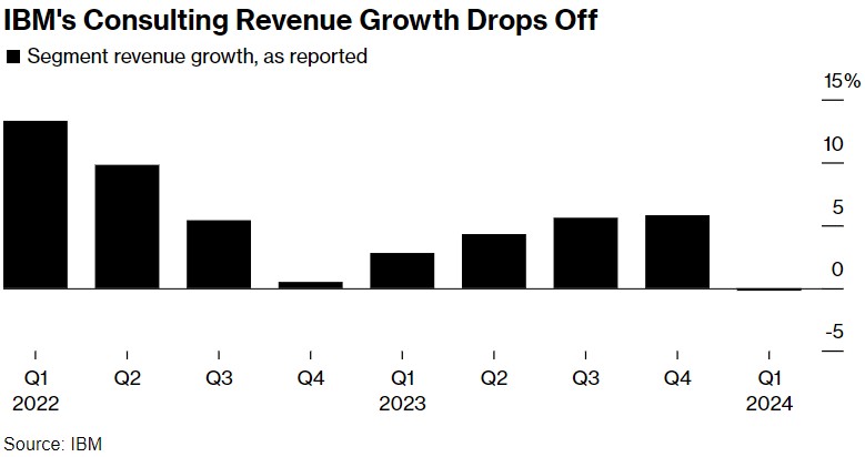 投资者一直在关注 IBM 第二大业务咨询部门可能出现的下滑。截至 3 月 31 日,该部门收入为 52 亿美元,与去年同期持平。