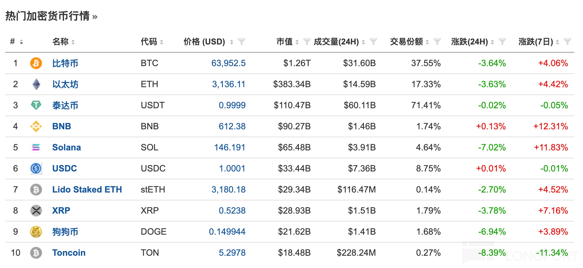 比特币现报 63952 美元,24 小时跌近 4%;以太坊现报 3136 美元,24 小时跌近 4%。