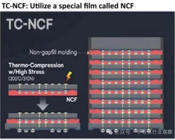 和 SK Hynix 不一样,在 HBM 封装上,三星采用的 TC-NCF(thermal compression with non-conductive film),也就是非导电薄膜热压缩。