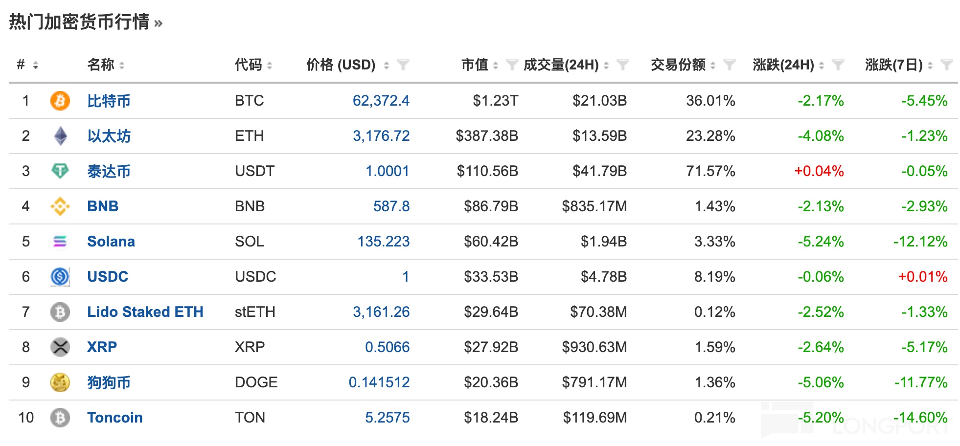 比特币现报 62372 美元,24 小时跌超 2%;以太坊现报 3176 美元,24 小时跌超 4%。