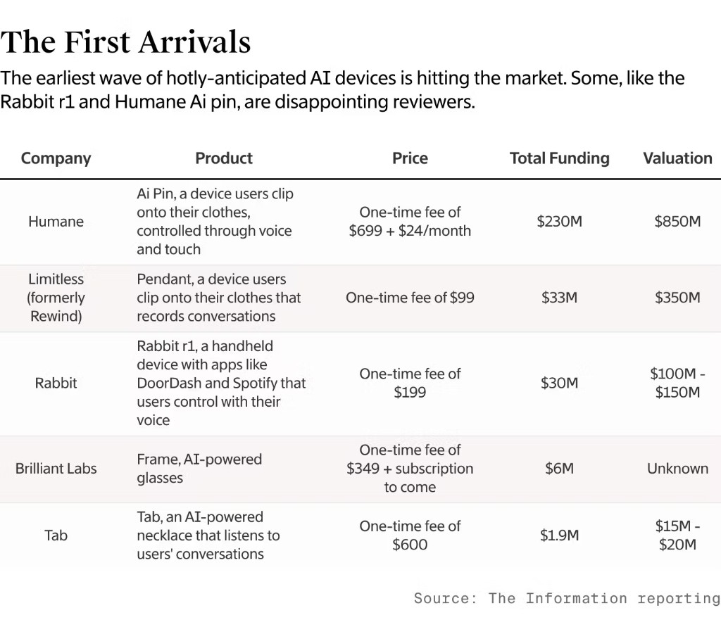 从 Humane Ai Pin 到 Rabbit r1,备受期待的 AI 硬件先行者们,交出的答卷普遍无法让人满意。昔日的科技热潮现已降温。这反映出人工智能技术应用于可穿戴硬件方面,目前仍存在显著的现实困境。