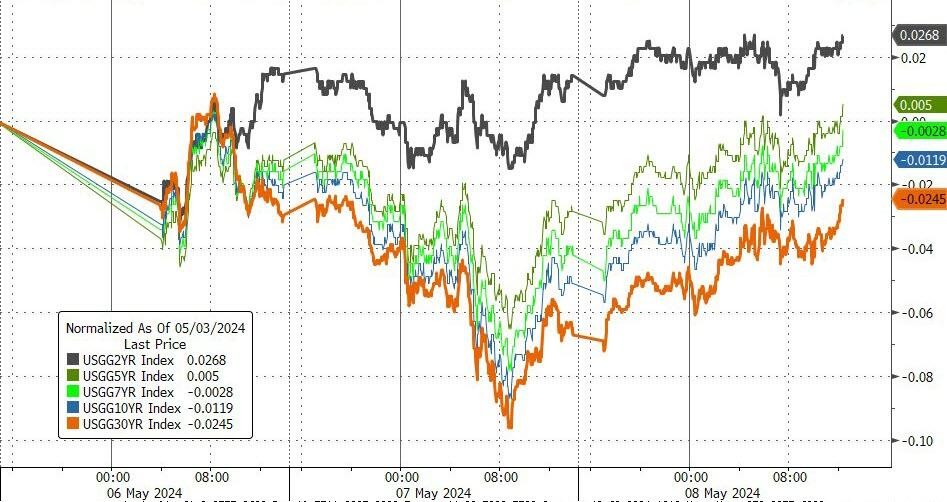 对利率前景更敏感的 2 年期美债收益率在欧股盘中曾升破 4.84% 刷新日高,美股早盘曾下破 4.82% 刷新日低,午盘重上 4.84%,十年期美债标售后,收益率保持 4.84% 上方,到债市尾盘时约为 4.84%,日内升约 1 个基点,仍远离上周五下破 4.71% 刷新的 4 月 10 日以来低位。