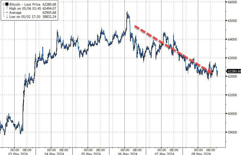比特币(BTC)继续下行,亚市早盘曾涨破 6.32 万美元刷新日高,美股盘初曾跌破 6.2 万美元、部分平台跌至 6.19 万美元下方,较日高跌超 1400 美元、跌超 2%,美股午盘曾重上 6.28 万美元,美股收盘后再度跌破 6.2 万美元,并一度跌破 6.17 万美元刷新日低,刷新 5 月 3 日以来低位,最近 24 小时跌超 2%,继续跌离周一涨破 6.5 万美元后刷新的 4 月 24 日上上周三以来高位。