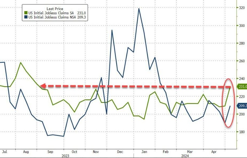 美国劳工部周四公布的数据显示,美国 5 月 4 日当周首次申请失业救济人数 23.1 万人,为 2023 年 8 月 26 日当周以来新高,也是自 2021 年以来的第三大单周增幅,超出预期 21.2 万人,前值修正值小幅上修至 20.9 万人。