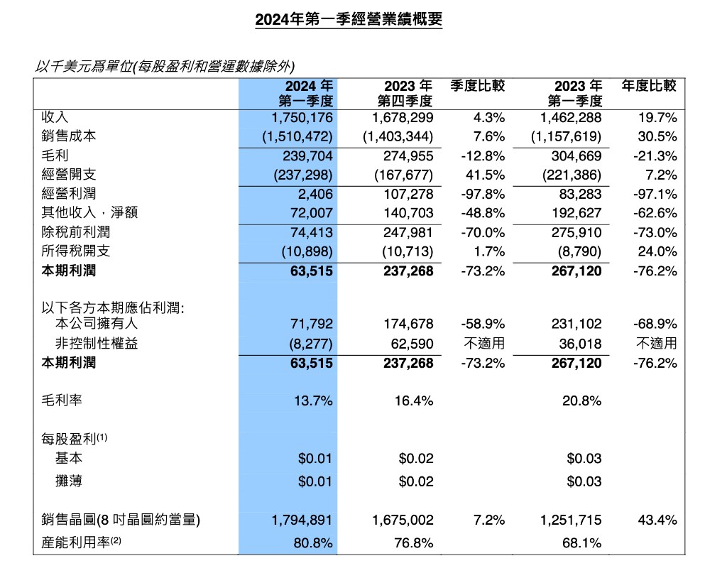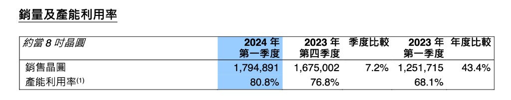 2024 年一季度全球客户备货意愿有所上升,公司销售收入为 17.5 亿美元,环比增长 4.3%;毛利率为 13.7%,均好于指引。出货 179 万片 8 吋当量晶圆,环比增长 7%;产能利用率为 80.8%,环比提升四个百分点。