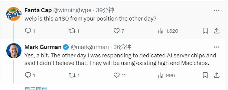 对于苹果将借助数据中心芯片推出 AI 功能的消息,有网友问爆料的科技业记者 Mark Gurman,这是不是代表他的态度才过一天就 180 度大转变,Gurman 说是的,之前他回复有关苹果致力于 AI 服务器芯片的消息时说,他不相信这点,现在他觉得,苹果要在服务器用上现有的高端 Mac 芯片了。