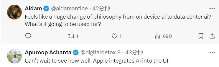 有网友评论称,感觉像是苹果的思维哲学经历了从端侧 AI 转向数据中心 AI 的大转变,不知道它会用来做什么。有网友称,迫不及待想知道苹果的 UA 结合 AI 能做得多好。还有网友提到 AI 芯片的王者英伟达,称苹果的这个消息不代表英伟达就完蛋了。