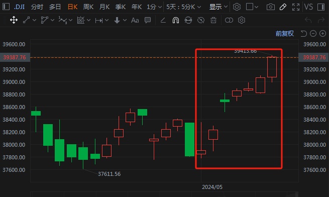 截至 5 月 9 日美股收盘,道指收涨 331.37 点,涨幅 0.85%。5 月以来,道琼斯工业平均指数已连涨七日,连续三日创下 2023 年 12 月 19 日以来最长连涨,5 月累计上涨 4.16%,超过标普 500 指数 3.54% 的涨幅。