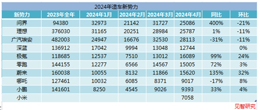 此外,造车新势力 4 月喜迎新玩家小米。小米 SU7 的首月秀表现相当不错,仅凭全国首批 29 个城市的 59 家门店的销售网络渠道,4 月的整体销量就达到 7078 辆,创下了业内新品牌首款车型上市首月的交付量新纪录。