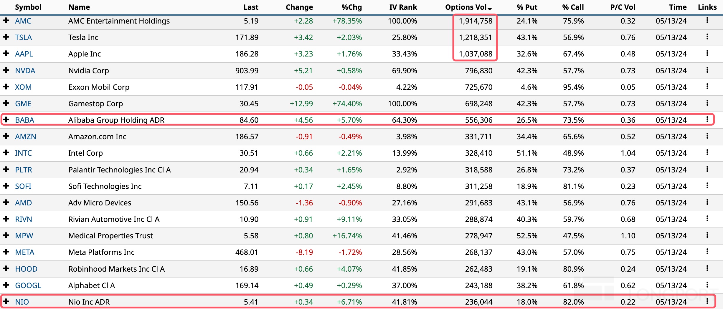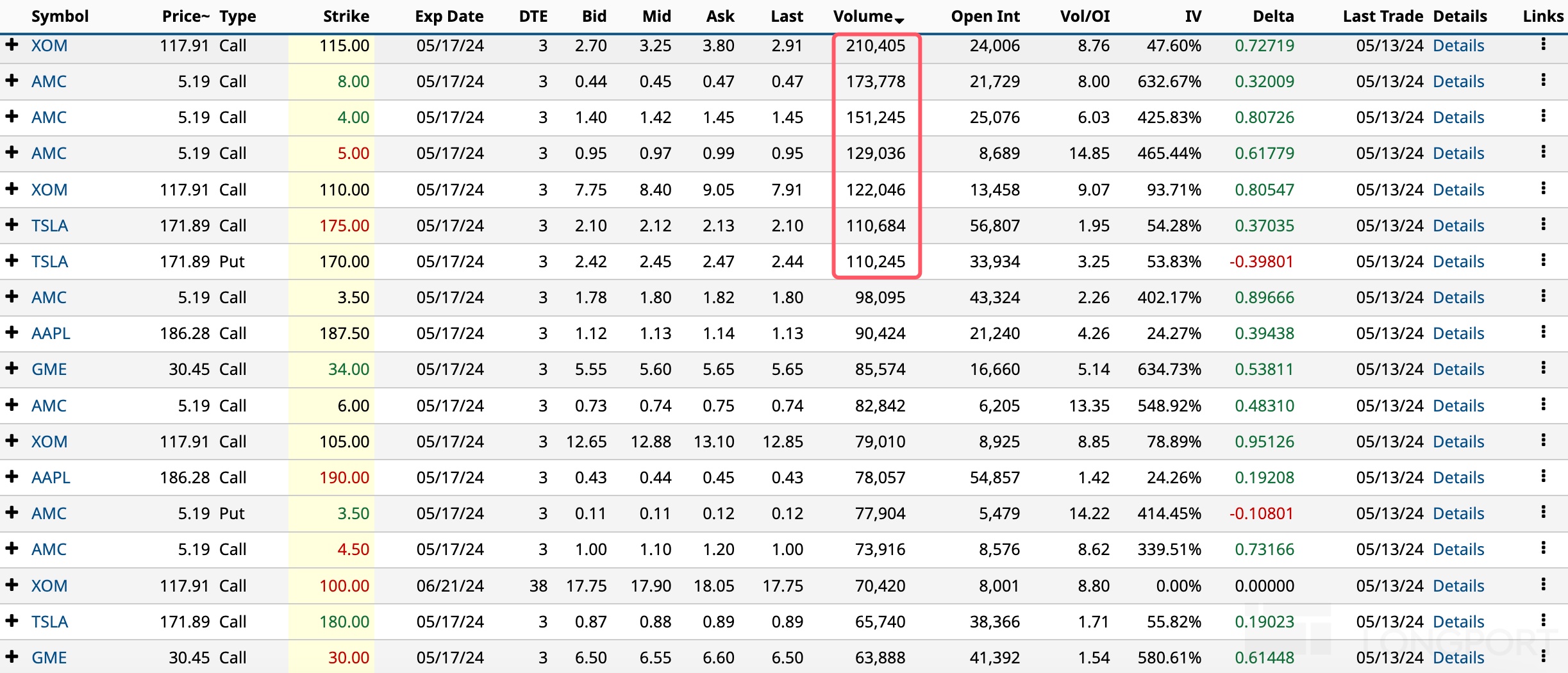 隔夜最火合约:5 月 17 日到期、执行价 115 美元的埃克森美孚 call,成交 21 万张!阿里期权成交暴涨至 55 万张,看涨期权占比 73.5%。AMC 期权成交暴涨至 191 万张,看涨期权占比 75.9%,执行价 8 美元的看涨期权成交 17 万张。