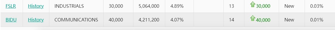 从持仓比例变化来看,“大空头” 迈克尔·巴里旗下 Scion 在第一季度前五大买入标的分别是:Sprott Physical Gold Trust、信诺、英国石油、First Solar Inc(FSLR.US) 以及百度 (BIDU.US)。其中,美国太阳能巨头以及中国科技巨头百度为新建仓标的,分别位列巴里旗下 Scion 持仓比例排名的第 13 以及第 14。