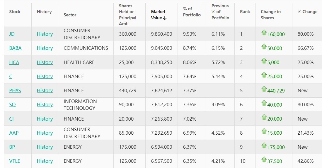 《大空头》原型迈克尔·巴里旗下 Scion 资产管理公司头号重仓股京东获大举增持 80%,第二大重仓股阿里巴巴也获增持近 67%。在前十大重仓股中,聚焦于实物黄金资产的共同基金——Sprott Physical Gold Trust 为该机构新建仓标的。