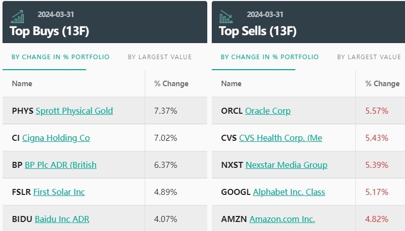 在前十大重仓股中,聚焦于实物黄金资产的共同基金——Sprott Physical Gold Trust (PHYS.US) 为该机构新建仓标的,其特点是直接持有实物黄金,而非黄金衍生品或股票,为有兴趣持有实物金条的投资者们提供交易所交易之下的投资替代方案。Sprott Physical Gold Trust 一经建仓就位列第五,暗示 “大空头” 迈克尔·巴里在第一季度非常乐观地看好黄金未来走势。在美联储降息预期以及地缘政治局势等多重刺激下,黄金现货以及期货价格今年以来可谓一路狂飙,终于在 4 月份冲上这一历史最高位。在 4 月份,黄金价格一度创下每盎司逾 2400 美元的这一历史新高点位,主要因当时市场担心伊朗攻击以色列可能导致中东战争升级。美国医疗保健服务提供商信诺 (CI.US) 以及欧洲石油巨头英国石油 (BP.US) 也为前十大持仓中的新建仓标的。