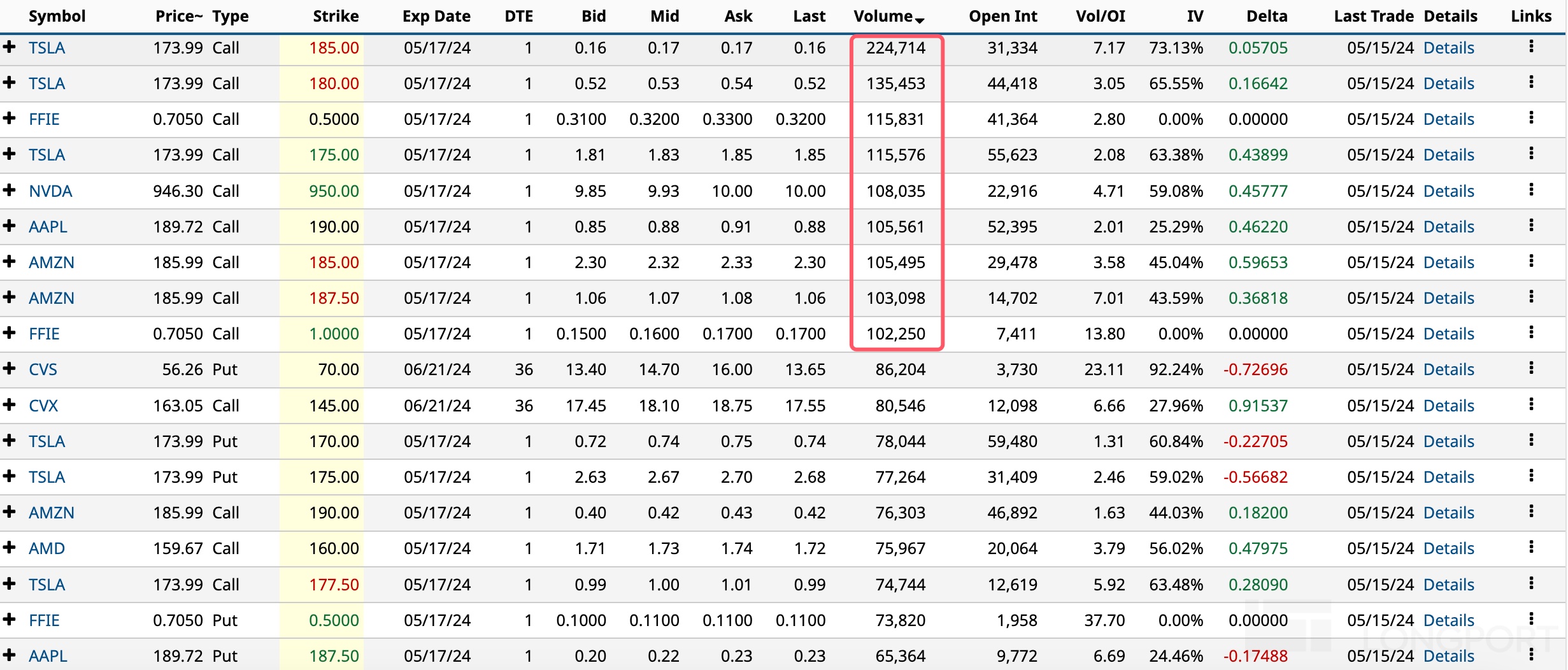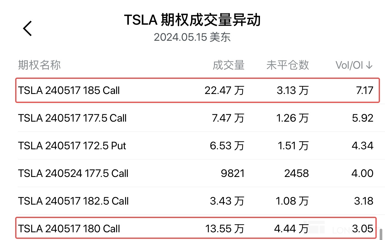 隔夜最火合约:5 月 17 日到期、执行价 185 美元的特斯拉 call,成交 22 万张。法拉第未来股价暴涨 147%,期权成交暴涨至 47 万张,看涨期权占比 80.5%,执行价 0.5 美元的看涨期权成交 11.5 万张,执行价 1 美元的看涨期权成交 10 万张。