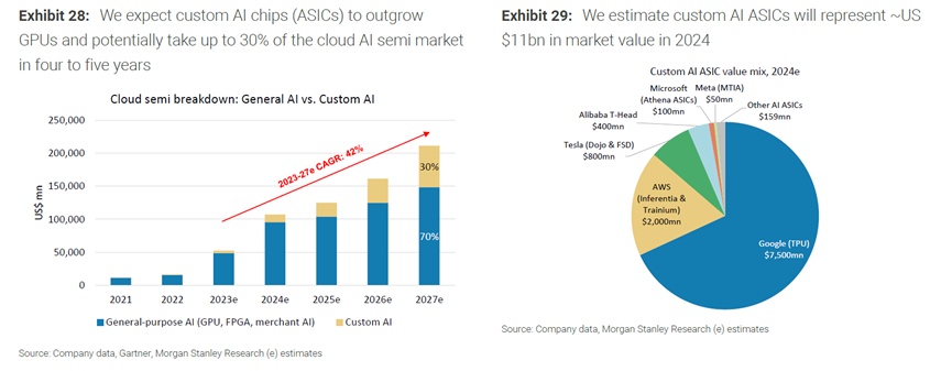 大摩预测 ASIC(定制化 AI 芯片)将在未来几年内超过 GPU 的增长速度,并有可能在四到五年内占据云 AI 半导体市场 30% 的份额。