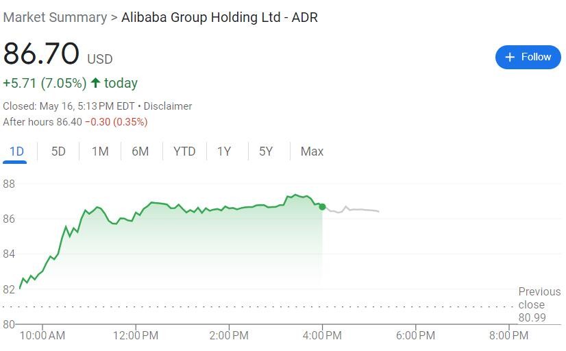 美东时间 5 月 16 日周四,在美上市阿里巴巴中概股开盘涨 1.2%,早盘拉升,日内涨幅扩大到 7% 以上,午盘涨幅曾达 7.5%,后维持 7% 左右的涨幅,收涨 7.05%,创 2023 年 11 月 15 日以来收盘新高。